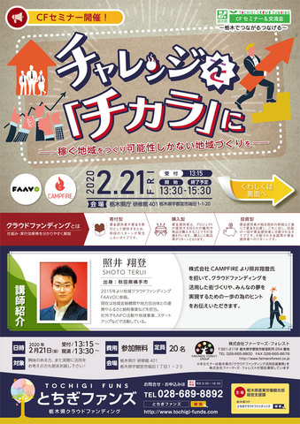 「株式会社CAMPFIRE・FAAVO」照井翔登氏をインターネットで繋ぎ、クラウドファンディングを活用した街づくりや、みんなの夢を実現するための一歩の為のヒントをお伝えいただきます。