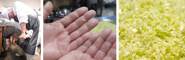 「どんだけ絞るんだっ!」と思うくらい丁寧に絞られたキャベツたち、水分は抜けているのに繊維がしっかり残っているのでキリリとしています。余分な水分がないので焼いた餃子からはヤシオポークからの旨汁だけが溢れ出してきます。
